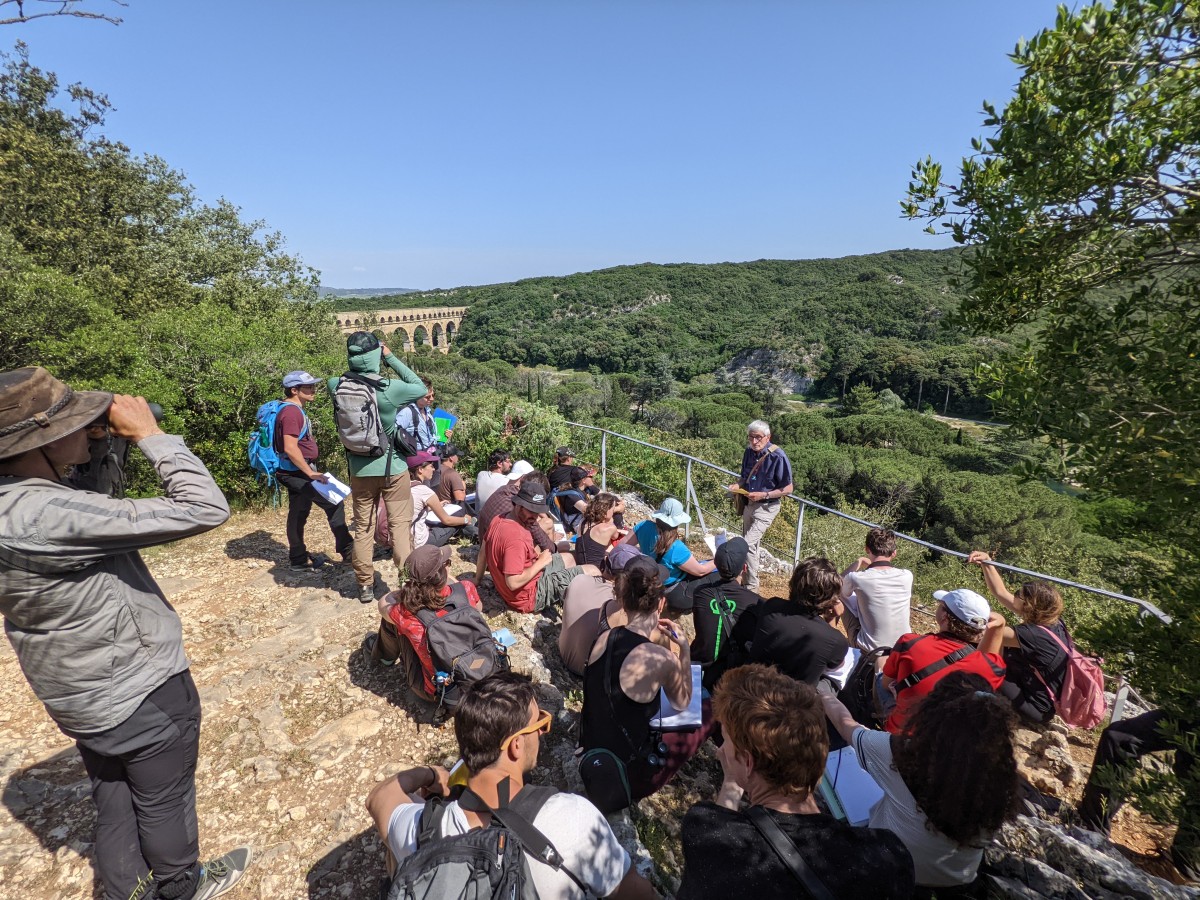 Régis Thomas devant des étudiants attentifs en sortie botanique au Pont du Gard